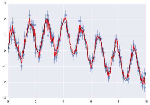 图中,平滑的灰色曲线表示真实模型,锯齿状的红色曲线则是随机森林的拟合结果。可以看到,非参数的随机森林模型足够灵活,无需我们事先指定多周期的模型结构,就能很好地拟合这种多周期信号的数据!