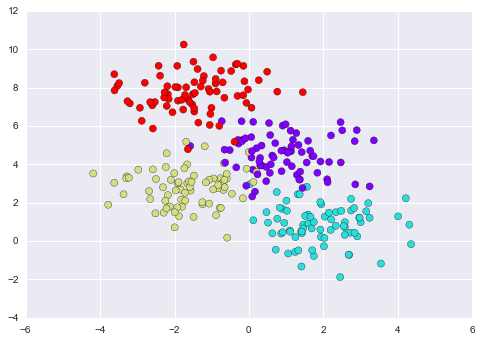 plt.scatter(X[:, 0], X[:, 1], c=y, s=50, cmap='rainbow');