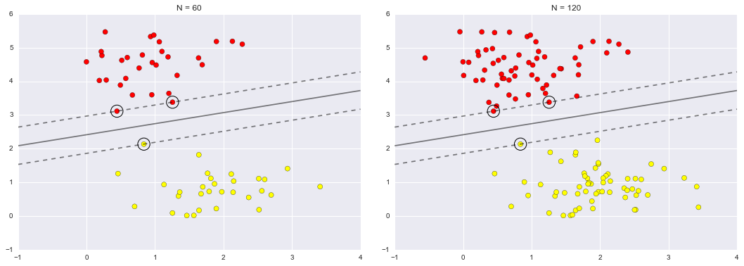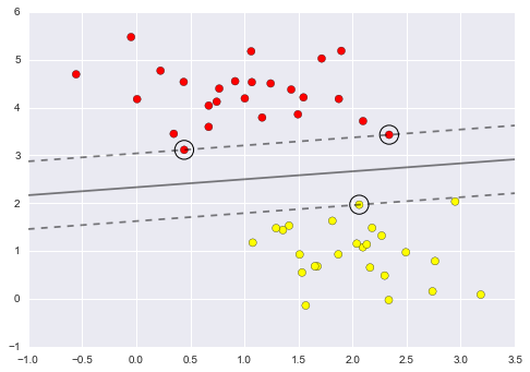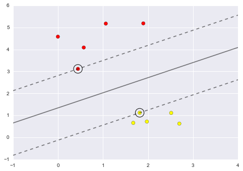 This is the dividing line that maximizes the margin between the two sets of points. Notice that a few of the training points just touch the margin: they are indicated by the black circles in this figure. These points are the pivotal elements of this fit, and are known as the support vectors, and give the algorithm its name. In Scikit-Learn, the identity of these points are stored in the support_vectors_ attribute of the classifier: