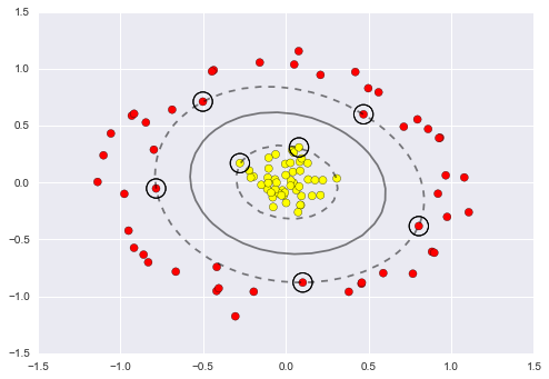 Using this kernelized support vector machine, we learn a suitable nonlinear decision boundary. This kernel transformation strategy is used often in machine learning to turn fast linear methods into fast nonlinear methods, especially for models in which the kernel trick can be used.