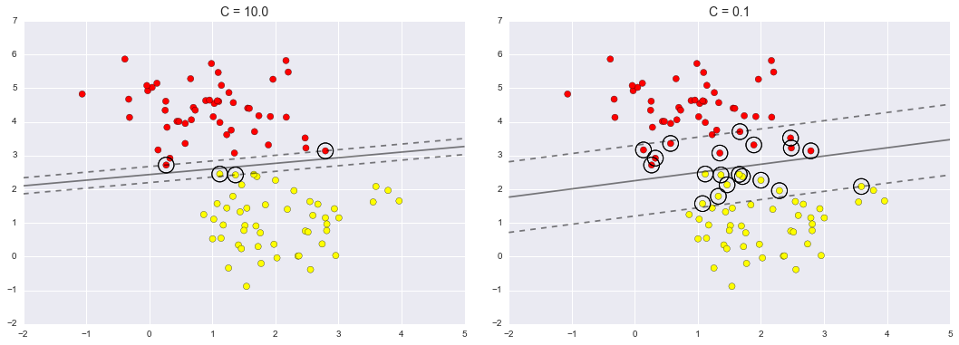 The plot shown below gives a visual picture of how a changing \(C\) parameter affects the final fit, via the softening of the margin: