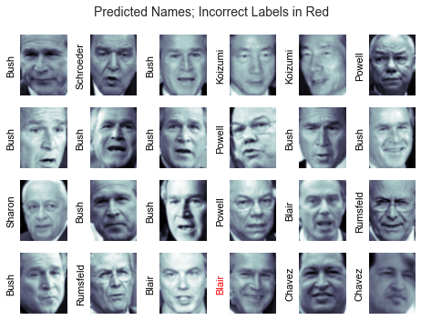 fig.suptitle('Predicted Names; Incorrect Labels in Red', size=14);