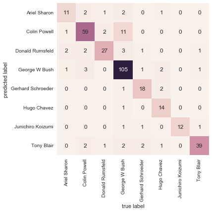 Out of this small sample, our optimal estimator mislabeled only a single face (Bush’s face in the bottom row was mislabeled as Blair). We can get a better sense of our estimator’s performance using the classification report, which lists recovery statistics label by label: