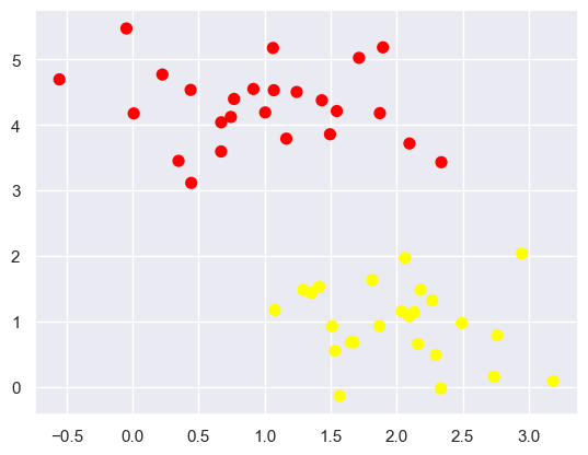 axi.scatter(X[:, 0], X[:, 1], c=y, s=50, cmap='autumn')