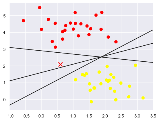 These are three very different separators which, nevertheless, perfectly discriminate between these samples. Depending on which you choose, a new data point (e.g., the one marked by the “X” in this plot) will be assigned a different label! Evidently our simple intuition of “drawing a line between classes” is not enough, and we need to think a bit deeper.