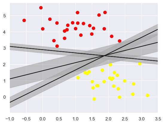 Support vector machines offer one way to improve on this. The intuition is this: rather than simply drawing a zero-width line between the classes, we can draw around each line a margin of some width, up to the nearest point. Here is an example of how this might look: