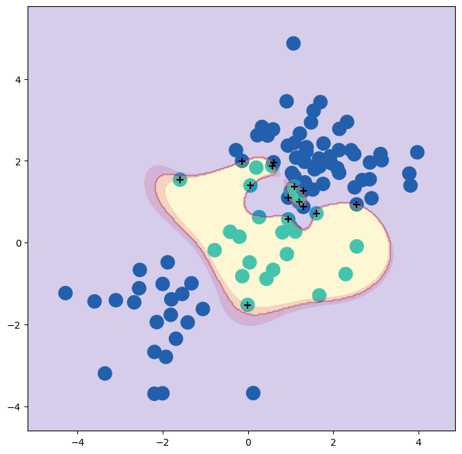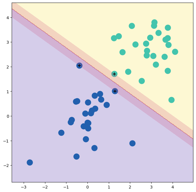 The support vector classifier with two features can be visualized by plotting values of its decision function. We have included a function for this in the ISLP package (inspired by a similar example in the sklearn docs).