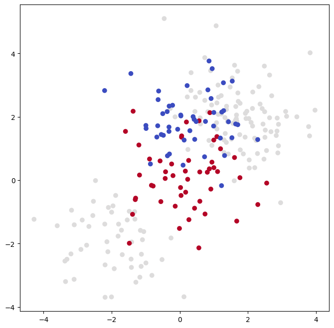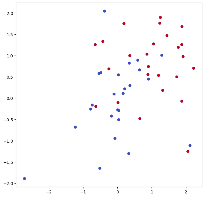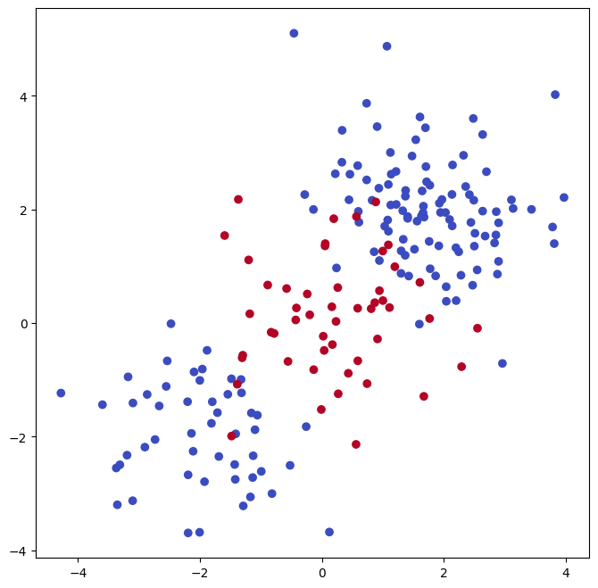 ax.scatter(X[:,0], X[:,1], c=y, cmap=cm.coolwarm);