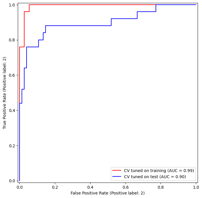 The function ROCCurveDisplay.from_estimator() (which we have abbreviated to roc_curve()) will produce a plot of a ROC curve. It takes a fitted estimator as its first argument, followed by a model matrix \(X\) and labels \(y\). The argument name is used in the legend, while color is used for the color of the line. Results are plotted on our axis object ax.