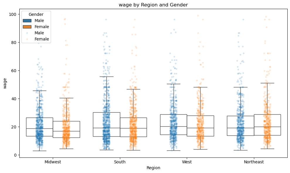 - 探索性数据分析:采用散点图、箱线图、小提琴图等可视化工具,分析工资在不同子样本 (不同教育水平、不同地区、不同性别等) 下的分布情况,以便初步了解工资与各个特征之间的关系;
