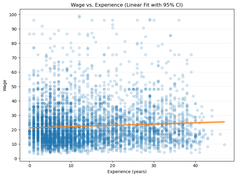 - 采用分仓散点图和回归线,分析工资与潜在工作经验之间的关系。