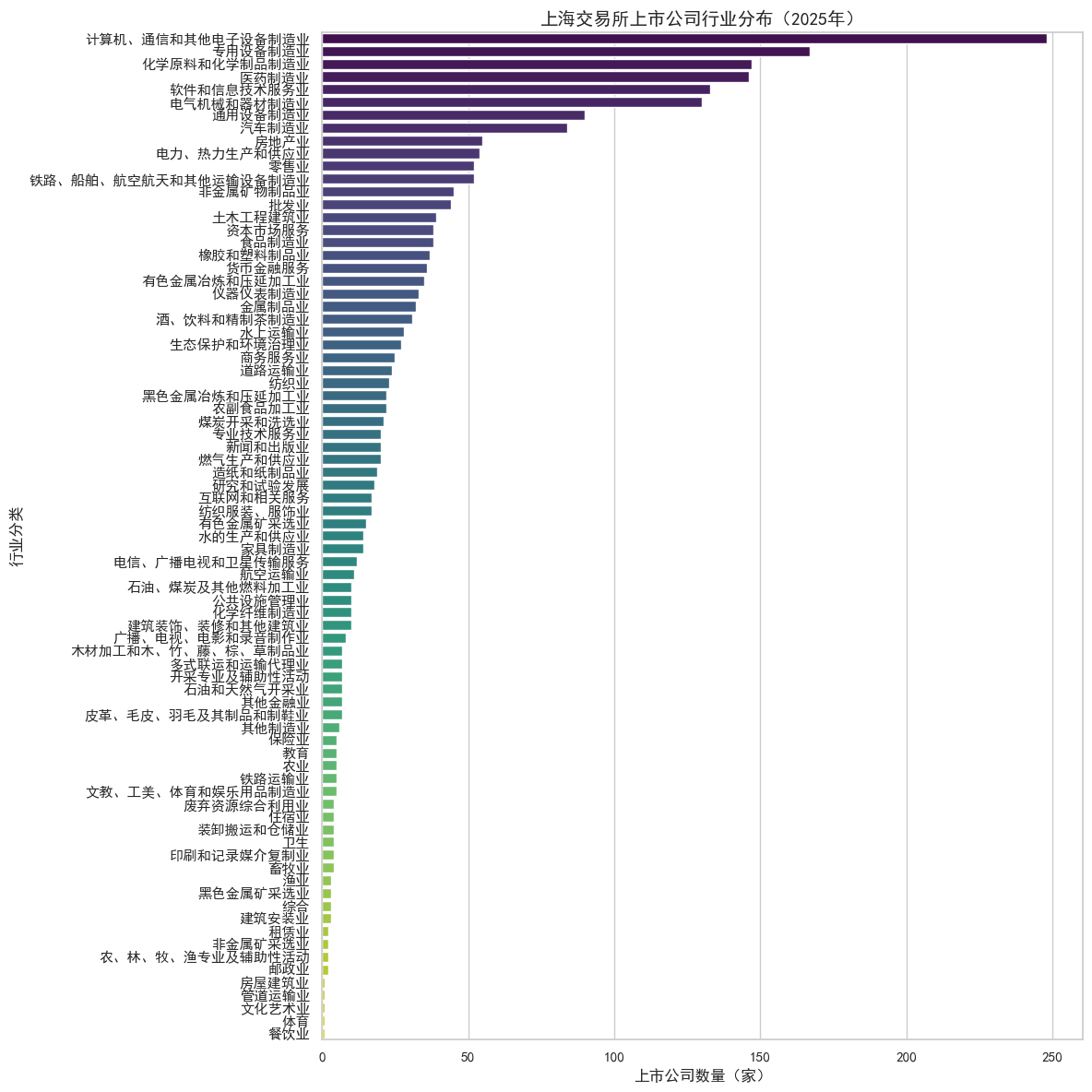 plot_industry_distribution(sh_industry, '上海交易所上市公司行业分布', '上市公司数量(家)')