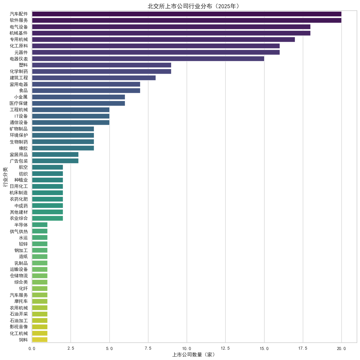 plot_industry_distribution(bj_industry, '北交所上市公司行业分布', '上市公司数量(家)')