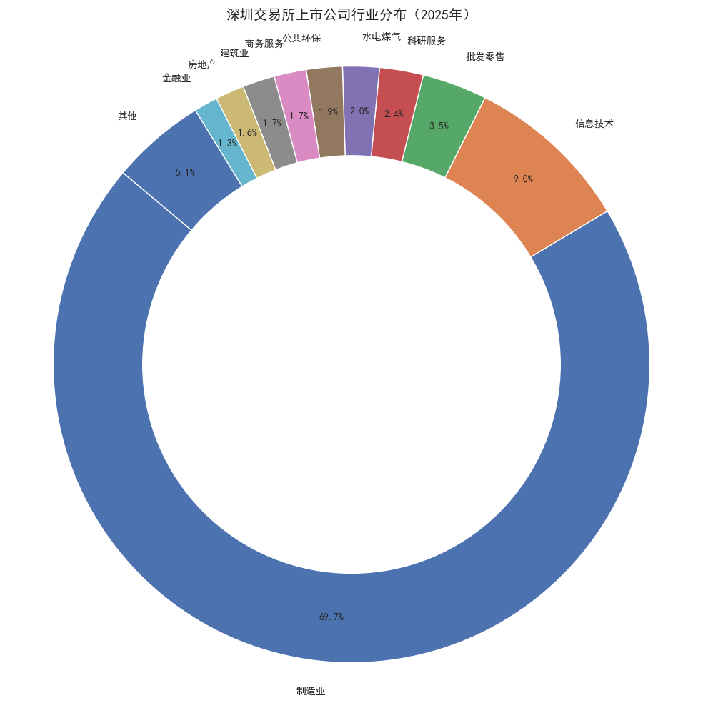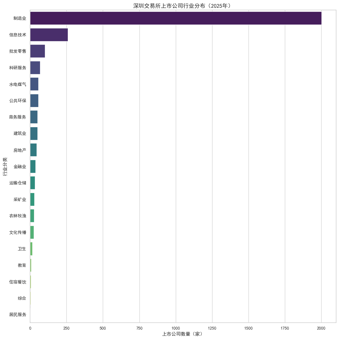 plot_industry_distribution(sz_industry, '深圳交易所上市公司行业分布', '上市公司数量(家)')