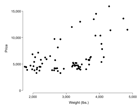 再看一个更完整的例子:使用 Stata 自带的 sysuse auto 数据集,绘制汽车价格与重量的散点图,并把图形保存到当前工作路径下。