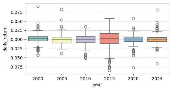 print(annual_stats[annual_stats['Year'] % 2 == 1][['Year', 'Mean Daily Return', 'Std Daily Return', 'Annualized Return', 'Annualized Std']].round(3).to_string(index=False)) Year Mean Daily Return Std Daily Return Annualized Return Annualized Std