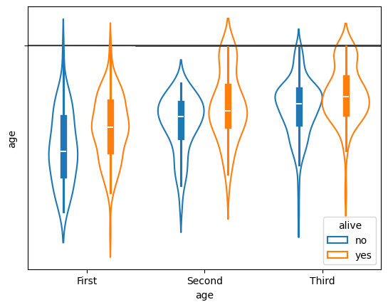sns.violinplot(data=df, x="class", y="age", hue="alive", fill=False)