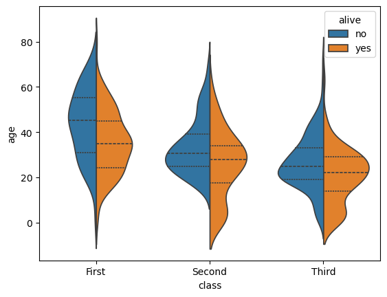 sns.violinplot(data=df, x="class", y="age", hue="alive", split=True, inner="quart")