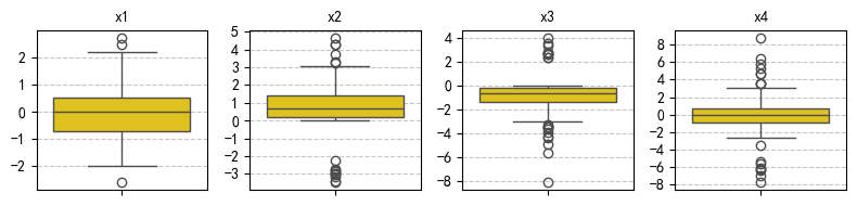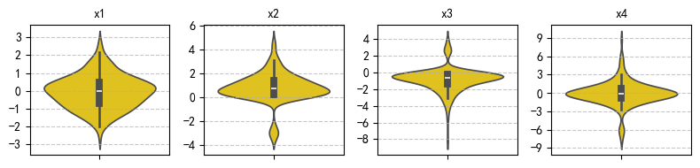绘图: 1. 1 行 4 列的子图:呈现四个序列的箱线图 2. 1 行 4 列的子图:呈现四个序列的小提琴图 3. 图形尺寸:8x2;y_titck: 取整数,疏密有度; 4. 子图标题用中文,字体为黑体,请假在必要的库 5. 屏蔽警告信息