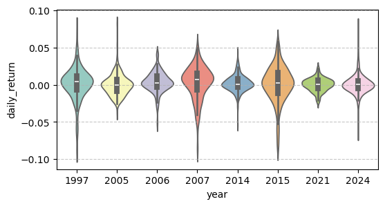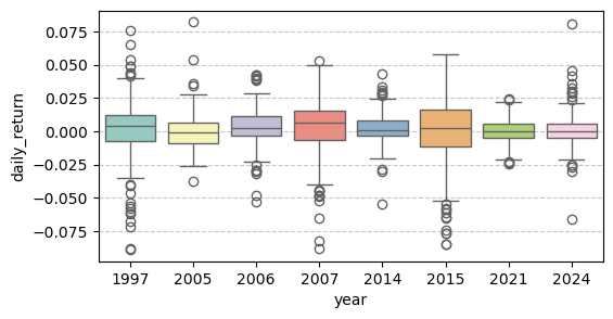 - 中位数大于零。1997年、2006 年、2007 年和 2015 年的中位收益率明显高于零,说明这些年份中有超过一半的交易日呈现正收益,整体市场偏强。