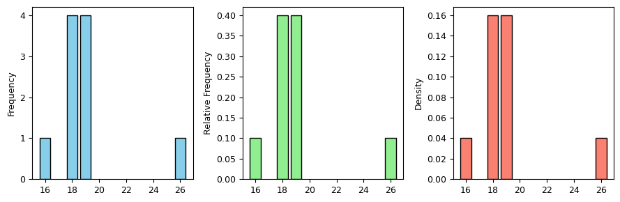 axes[2].bar(unique, density, color='salmon', edgecolor='black')