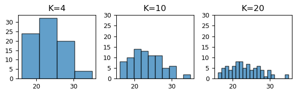 绘制一行图形,3 个子图,分别设定 K=4, K=10, K=20。