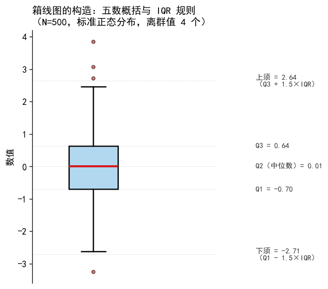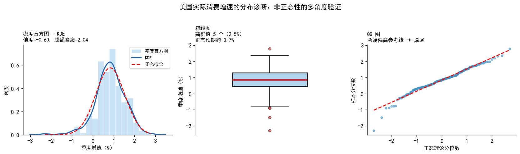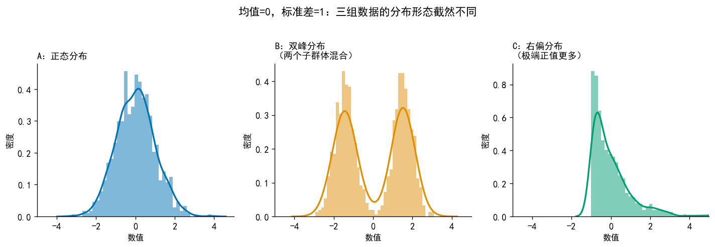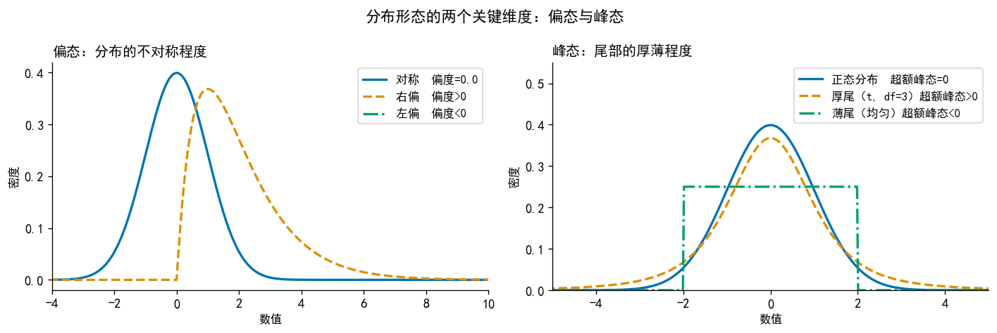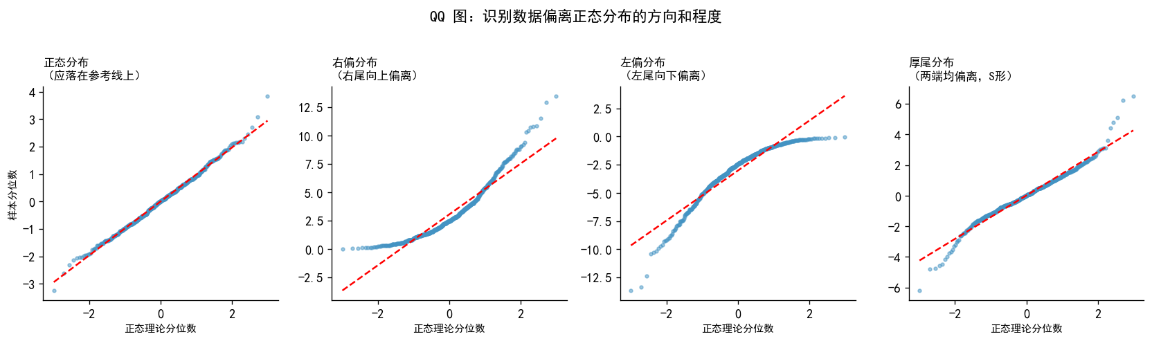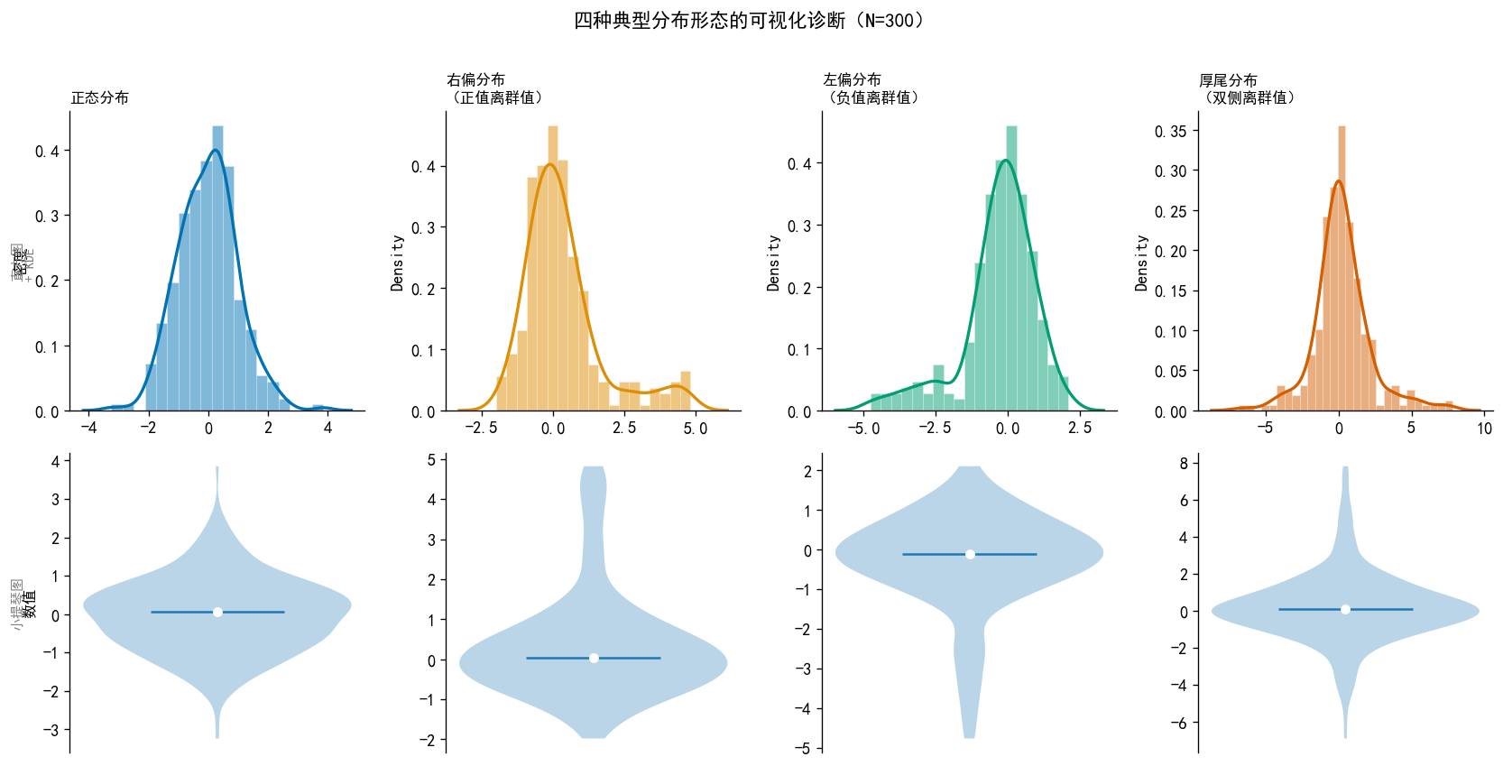 dist_names = ['正态分布', '右偏分布\n(正值离群值)', '左偏分布\n(负值离群值)', '厚尾分布\n(双侧离群值)']